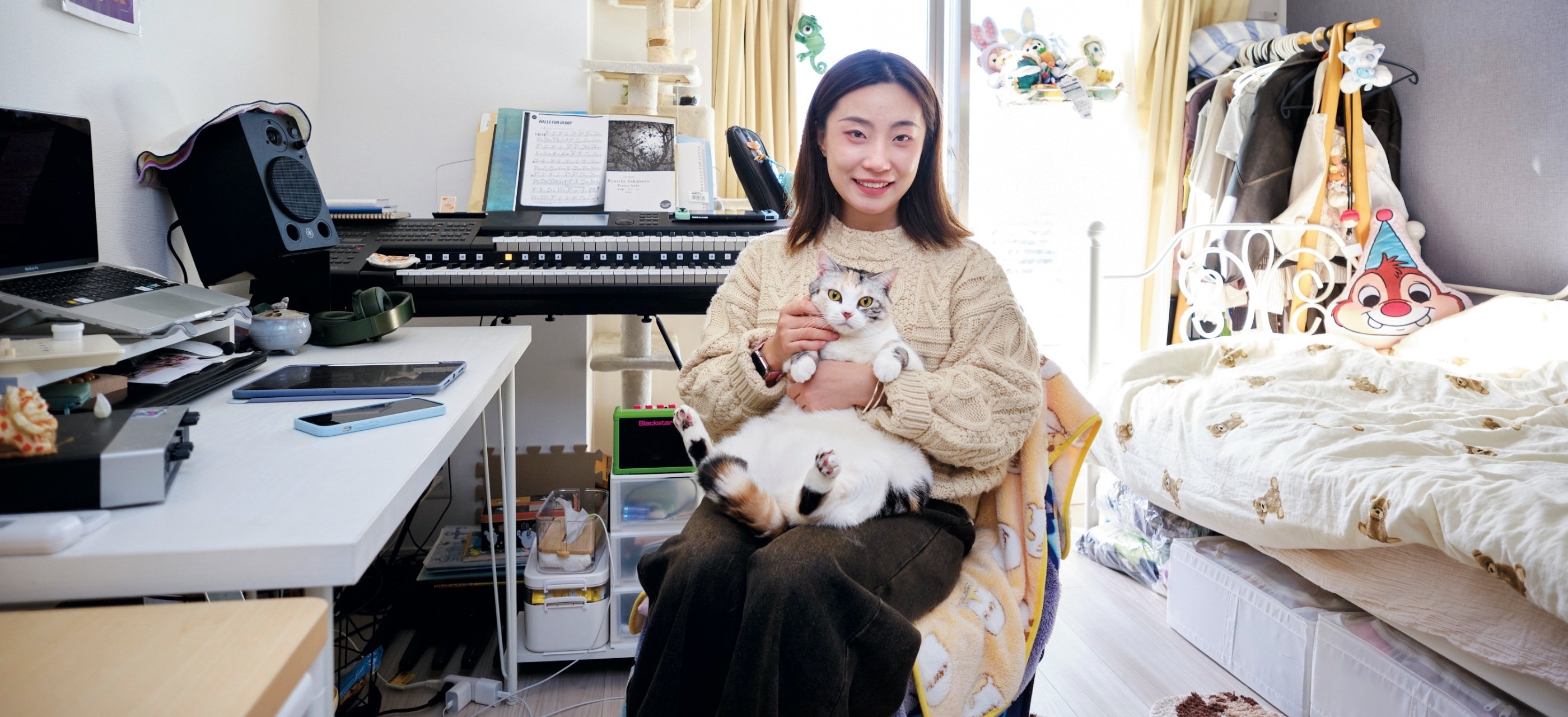 猫を飼ってるのでペットがOKで、2階以上のオートロックのマンションを探し、ここを見つけました。新築で公園が近く、景色と日当たりが良いのもポイントが高いです!壁紙の西面がグレーでそこもお気に入りです!あと、料理が好きなのでIHじゃなくてガスコンロが備え付けてあるところも重要。直火が美味しいんです(笑)。料理は郷土料理のお粥や野菜炒めを作りますね。留学して、慣れない環境でストレスが溜まることもありますがそんな時は、友達とディズニーランドやピューロランドへ行ったり、好きな料理を食べに行ったり、映画を見たりして、発散してますね。友達を呼んで、ホームパーティーもしますよ!MI TOKYOへ留学を決めたのは、友達の勧めもありますが、体験入学で、授業が面白かったことと、学校の雰囲気がフレンドリーで気に入ったからです!