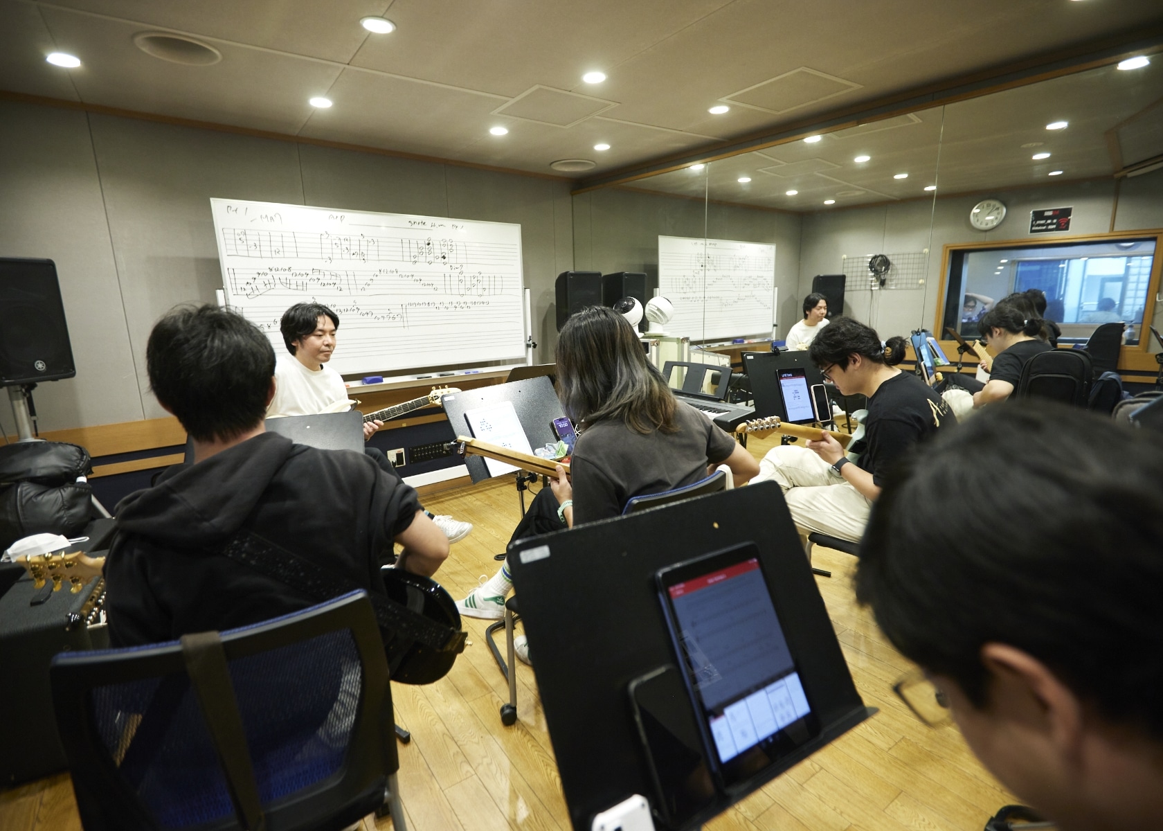 Techniqueで学んだスケール・コード進行をReadingで身につけた読譜技術で理解しながら、バンドアンサンブルの中で演奏する実践的授業です。ギタリストとしての引き出しを増やしていくと同時に、アンプの使い方やバンドサウンドでの音作りについても身につけていきます。
