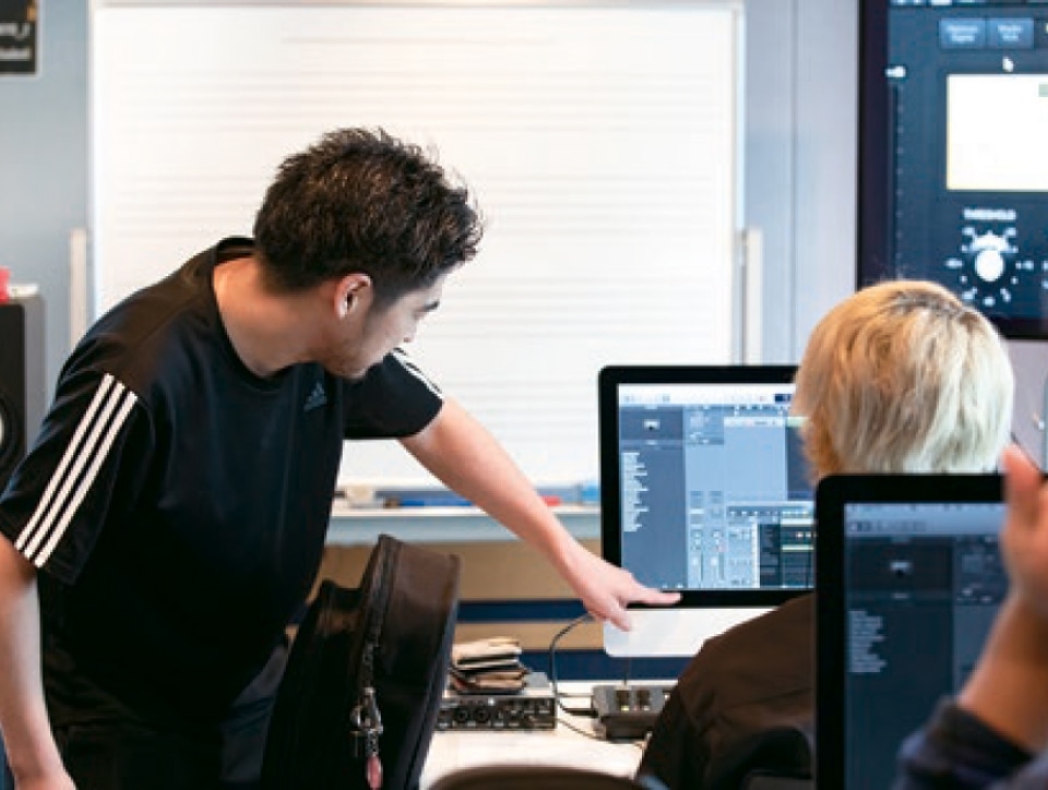 パソコンを使用した音楽制作に必要な技術や操作を修得していきます。DAWソフト「Logic Pro X」の基本操作・ミキシング・マスタリング・シーケンス・サンプリング・レコーディングなどを学んでいきます。